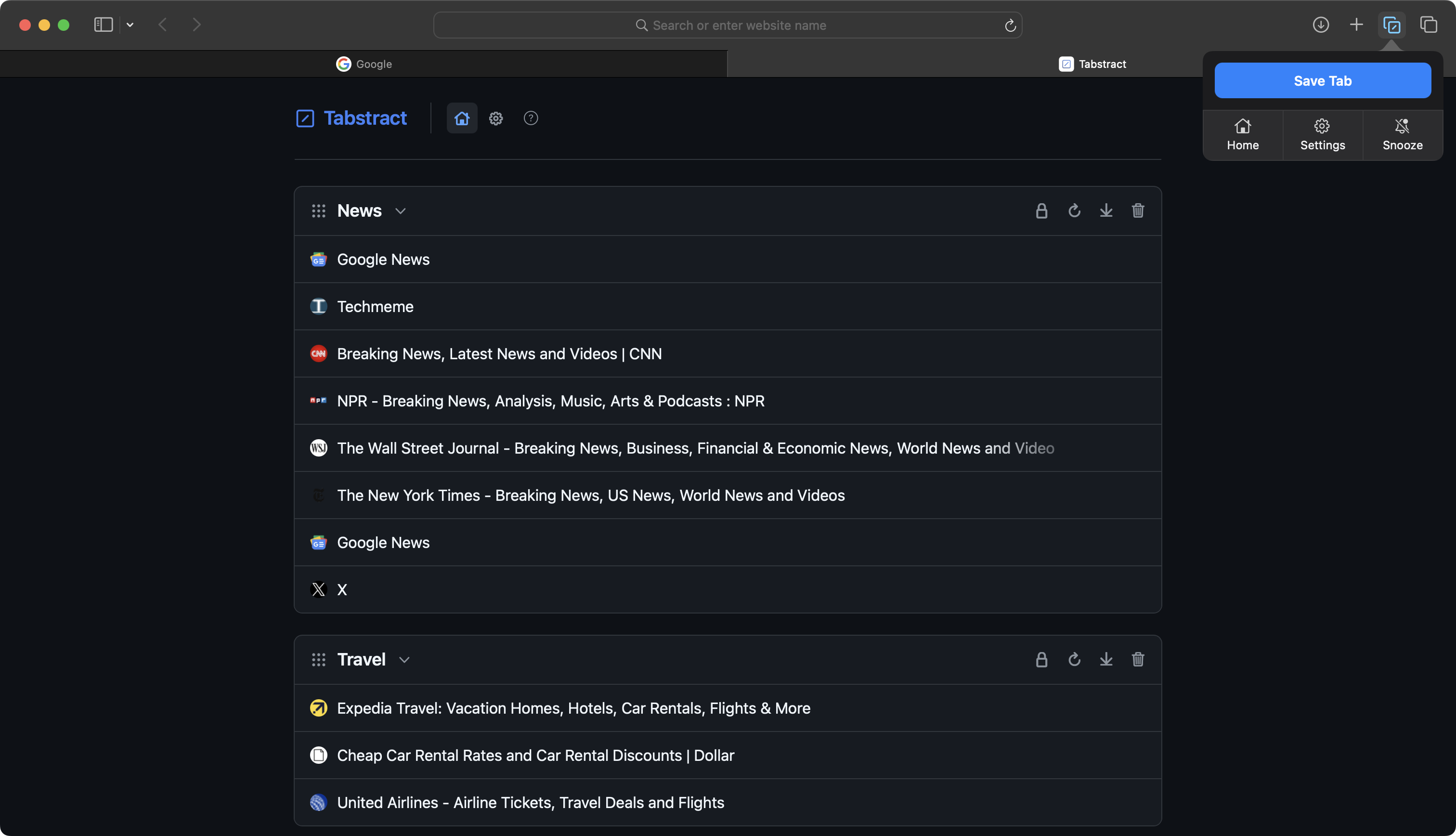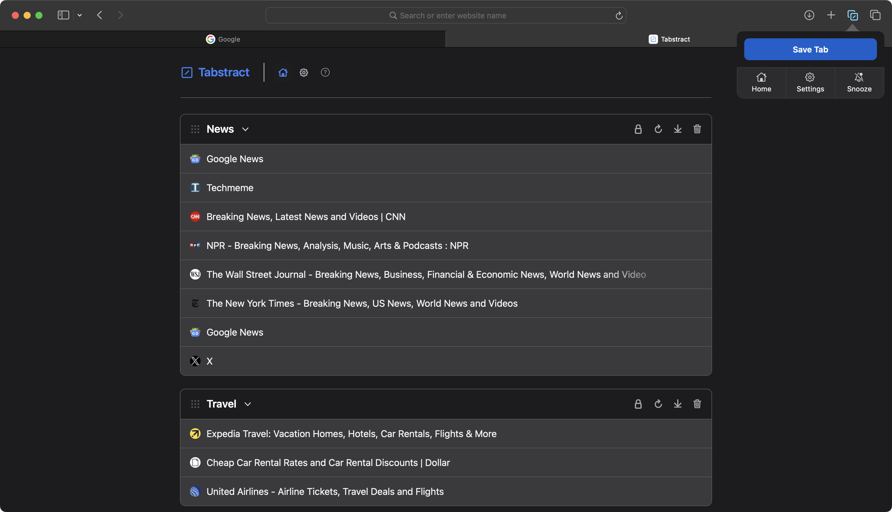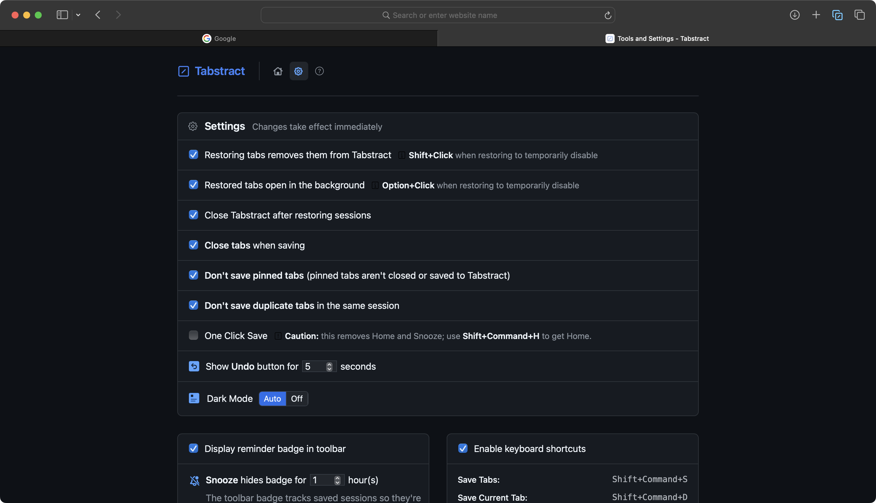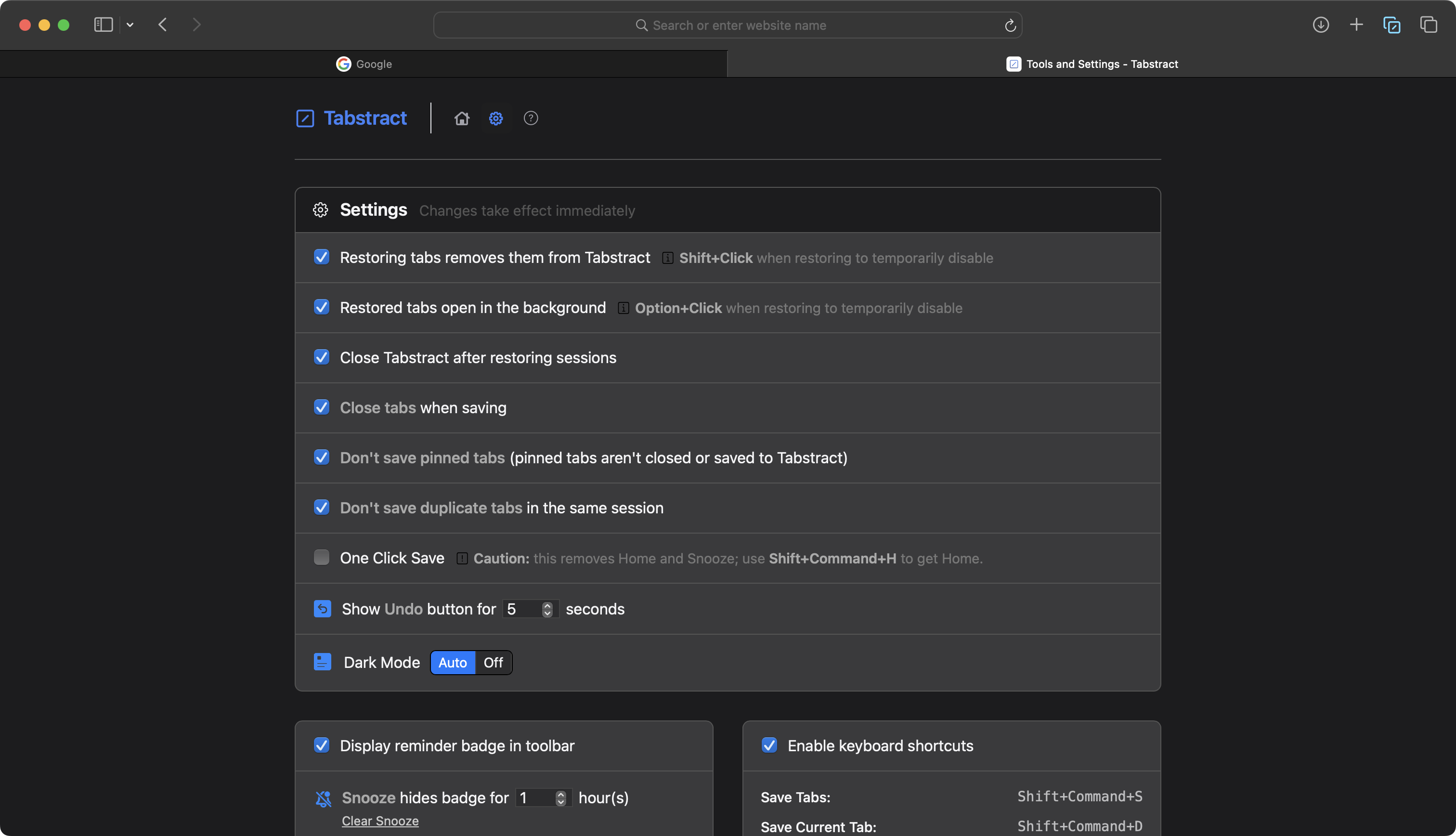 Tabstract v1.6 overhauls our previously half-baked Dark Mode into a first-class experience, including new settings. Snooze: you can now unsnooze directly from the toolbar. Various bugs fixed too.